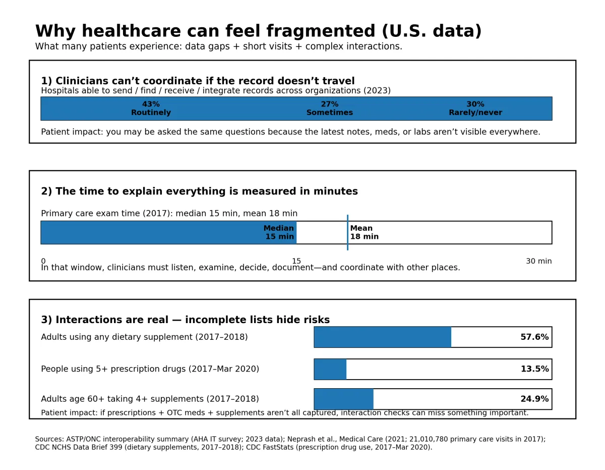 Your health information is still too often trapped in silos. Even in 2023, only 43% of hospitals routinely met the full “send / receive / find / integrate” interoperability standard; another 27% only did so sometimes—meaning updates and context don’t reliably follow the patient across systems. HealthIT+1
