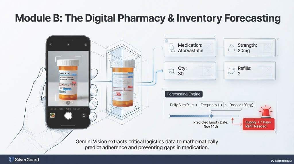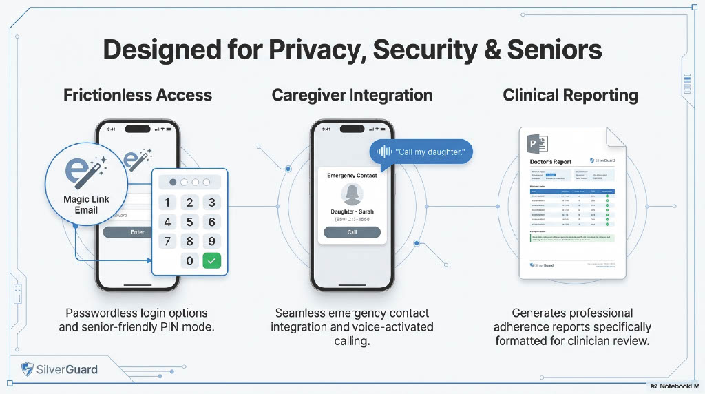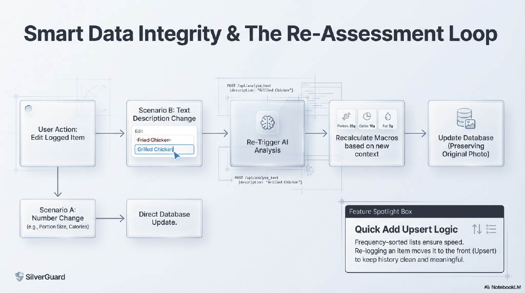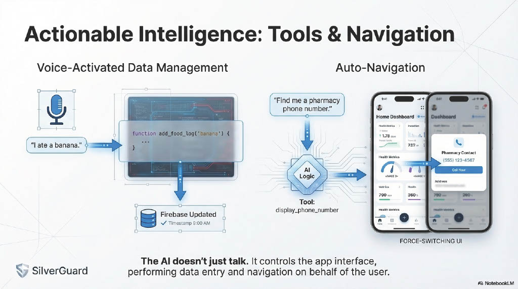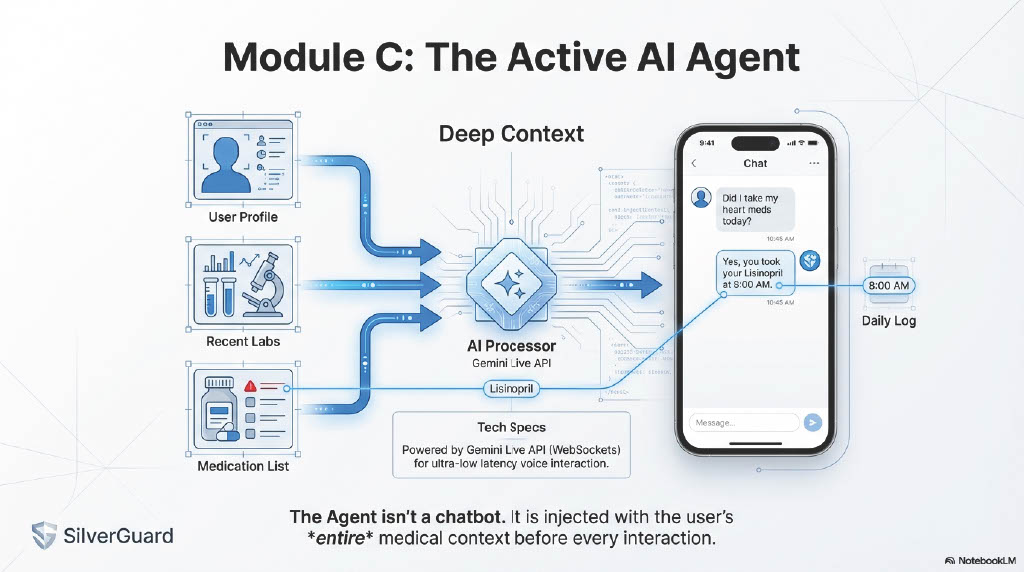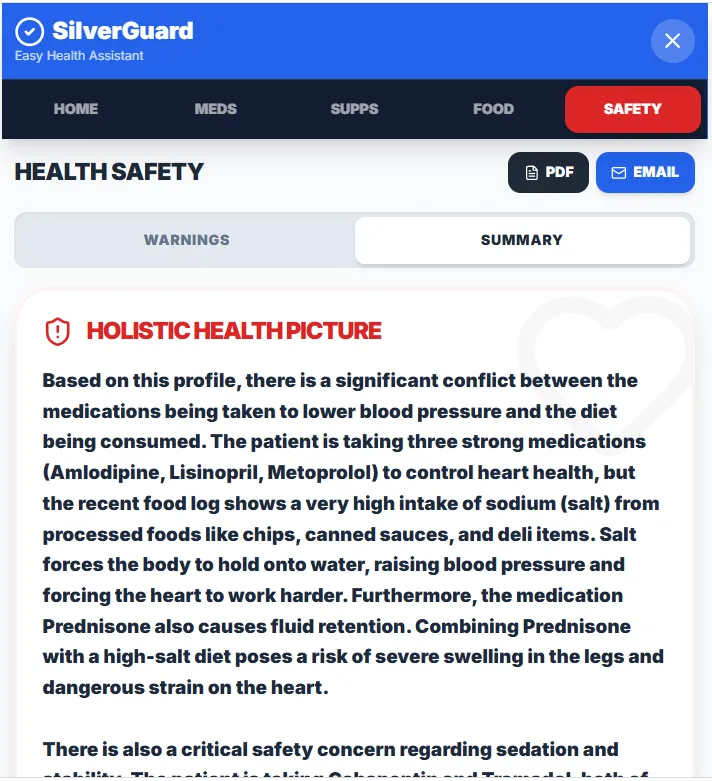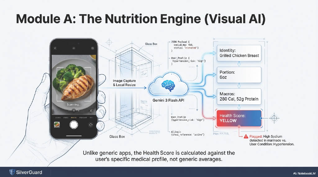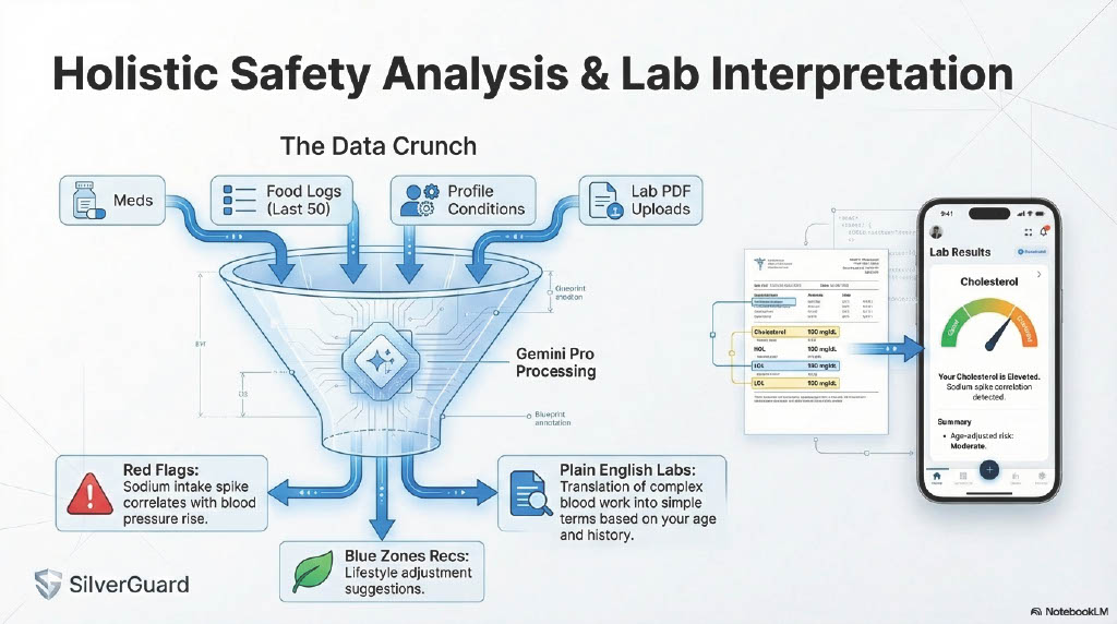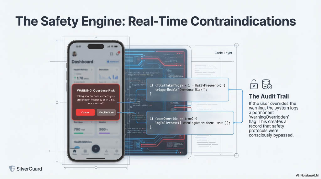 Example: Instead of just logging "Spinach Salad," SilverGuard alerts: "Warning: Dr. Smith increased your Warfarin dosage yesterday. This salad contains high Vitamin K and may block your medication. Contacting care provider..."