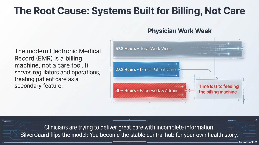 Today’s medical record is built to power billing, compliance, and operations—not to help patients (or even clinicians) get a clear, complete health story. Documentation burden is heavily influenced by billing guidelines and insurance rules, which drives “note bloat” and administrative work. AAFP+1